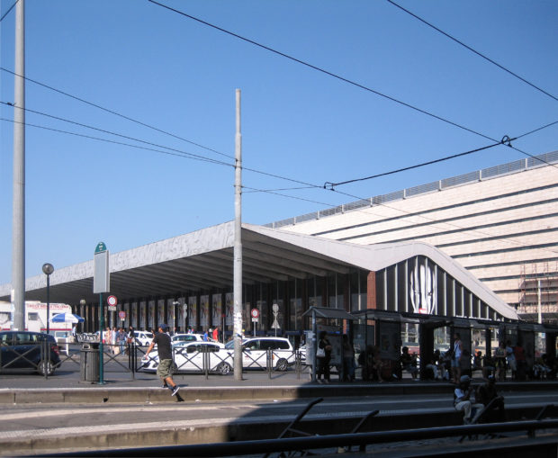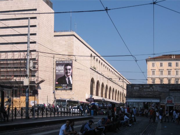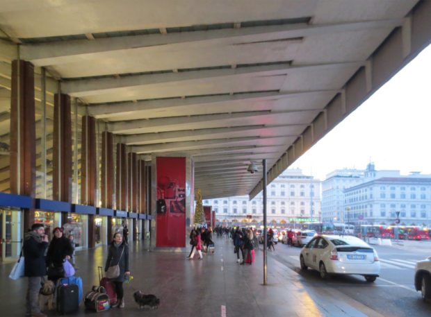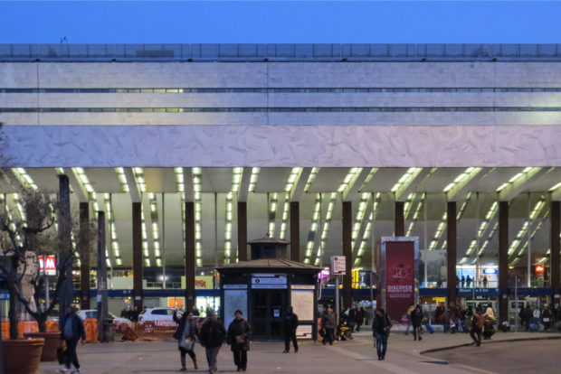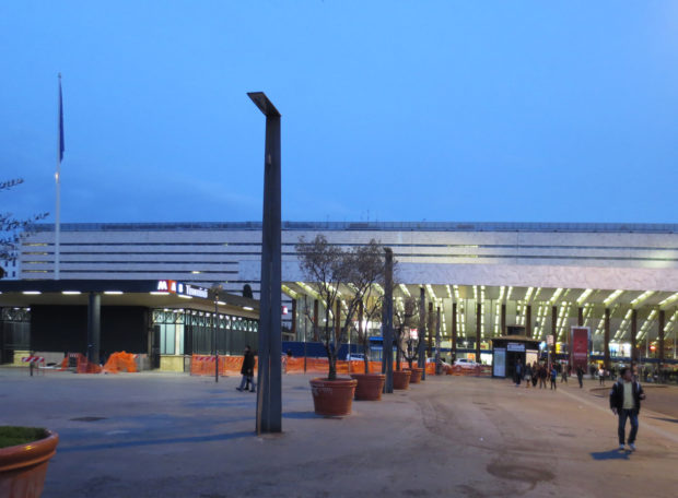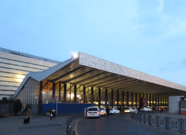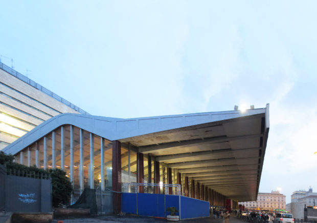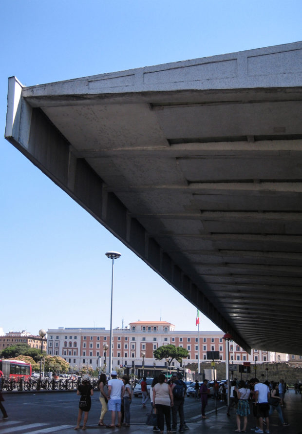 A atual estrutura da estação Termini compreende um dos edifícios mais importantes de Roma moderna, destacando o contraste entre a perspectiva das longas linhas revestidas com edifícios de travertino e a forma curva da placa do frontão da frente.