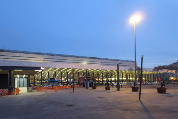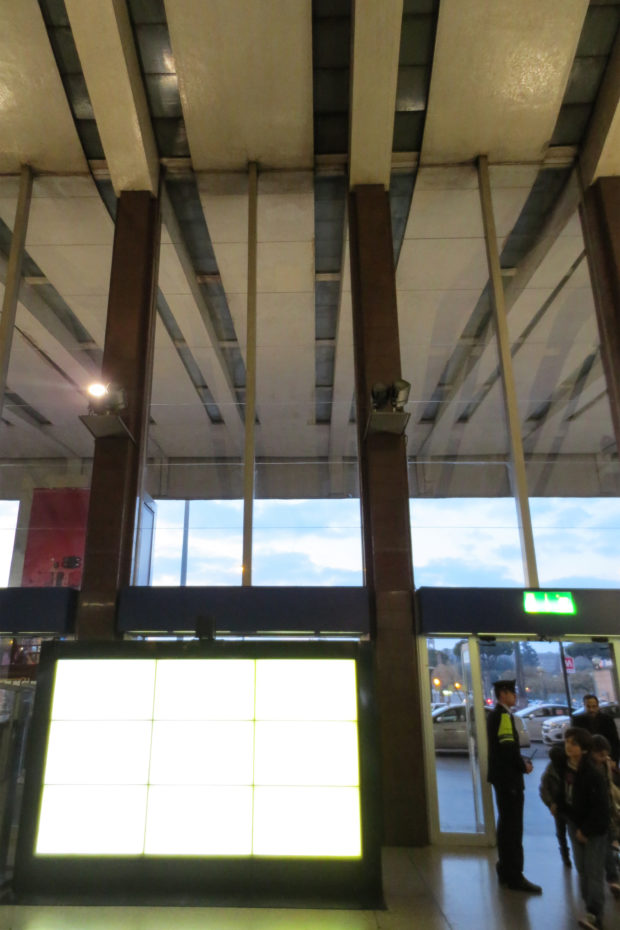 Nós nos encontramos duas analogias e contrastes em comparar a arquitetura da Vitelozzi Mazzoni e equipamentos – Montuori. organização Mazzoni escolheu um lado da estação e Montuori Vitelozzi um escoamento quase futurista através da construção final. Ambos também têm claras referências clássicas. Um exemplo da qualidade e diversidade na parte da estação Mazzoni, podem ser encontrados em (público) desconhecido pátio perto de uma sala de conferências. A forma como as colunas foram manipulados é uma reminiscência da arquitetura do pós-modernidade. pedras travertino transformou 45 e escalonadas uma em cima da outra para realizar uma fachada de escultura.