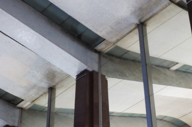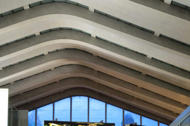 Este edifício transparente tem uma estrutura ondulada para um telhado pendendo que é suportado por 33 pilares de concreto armado curvas, 4m espaçadas, cobrindo o teto da sala grande e formam um dossel de 19m projecta para fora em direção à praça e inspirado pela curvatura do arco da parede adjacente romana.